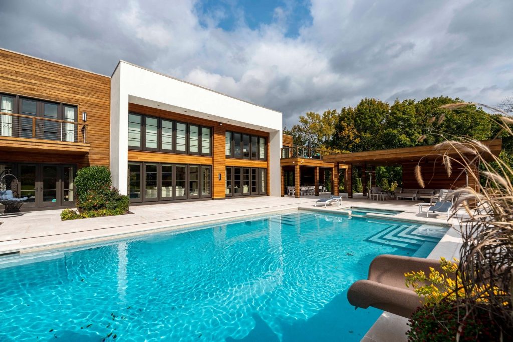 - Design & ConstructionLarge glass panels fill the house with light and visually extend the living areas toward the pool terrace. Natural wood, stone, and neutral colors create harmony and calm. Every element, from facade details to custom finishes, was crafted to achieve a refined, timeless look.
